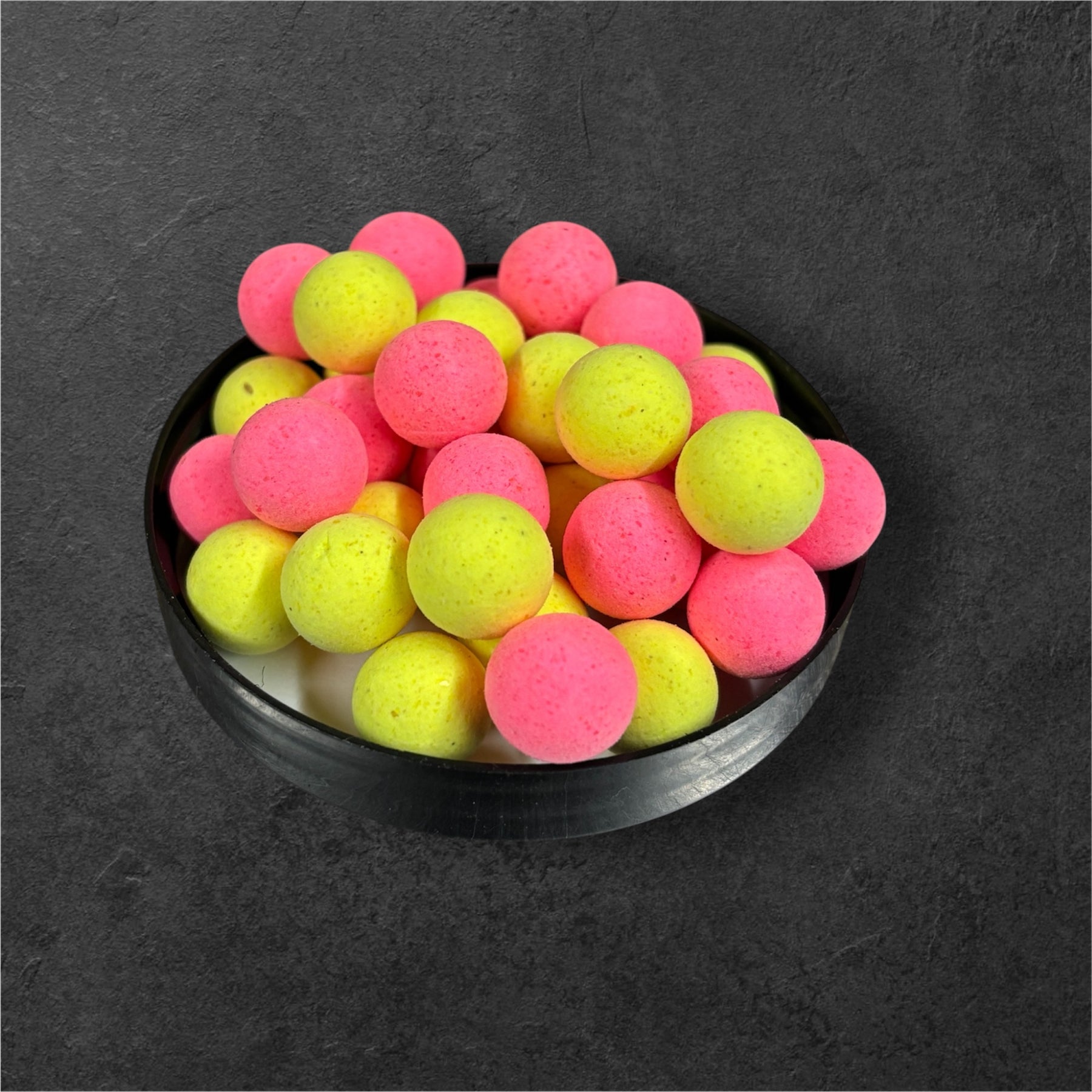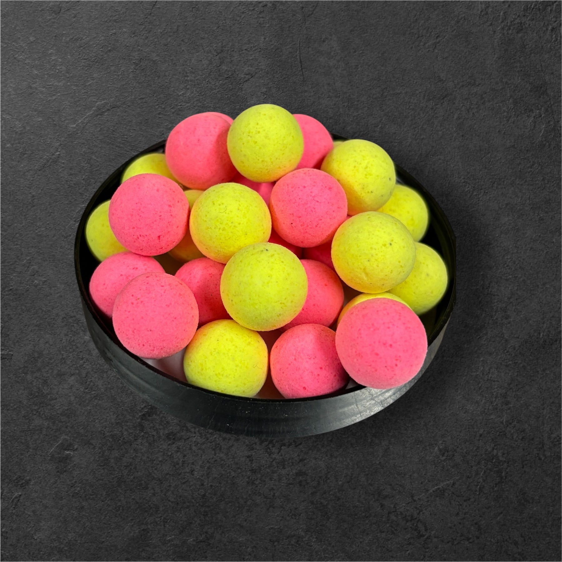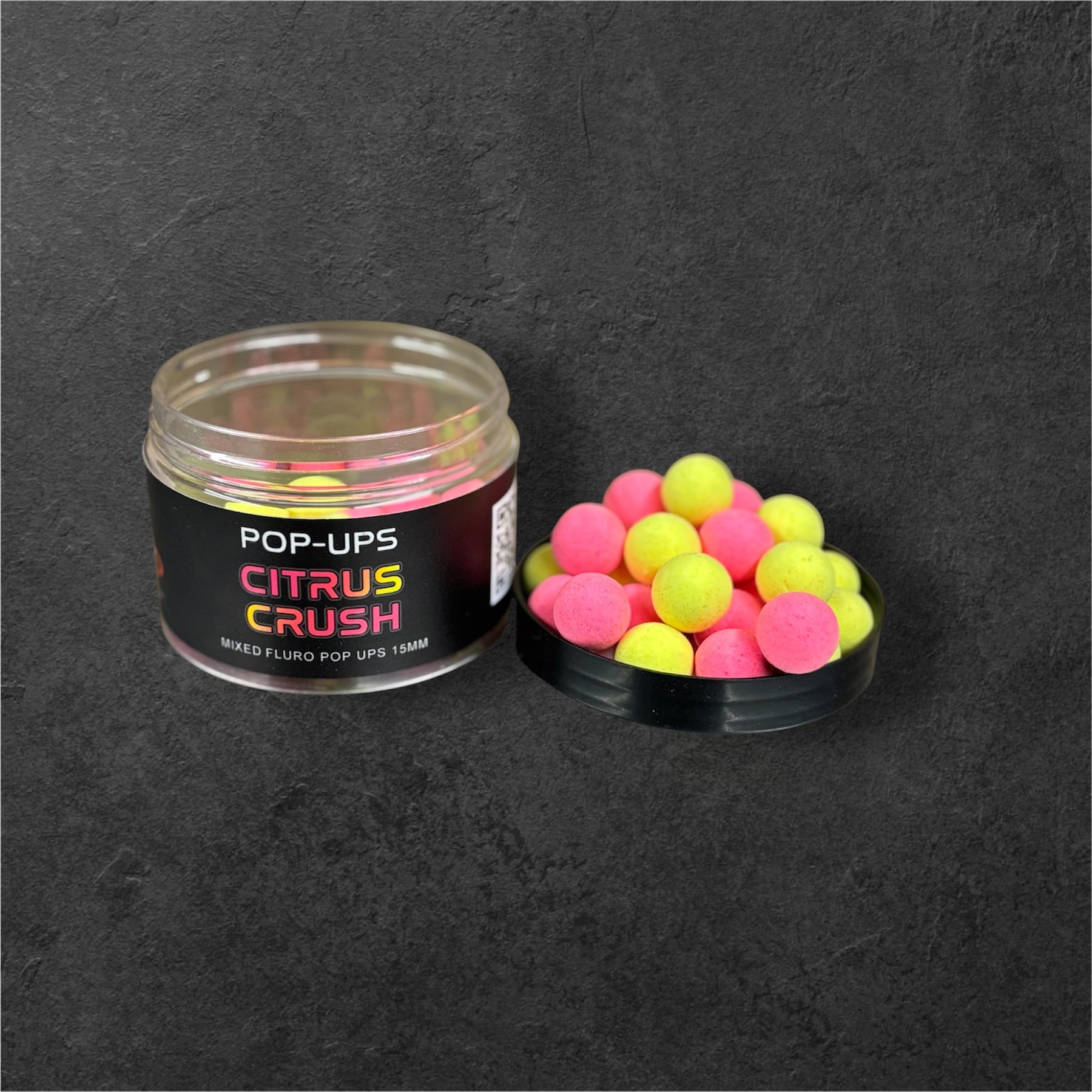 Curtis Crush fluoro pop ups in pink and yellow.  A unique citrus smell using both liquid and powder flavour.  These are available in pots of 12mm or 15mm.